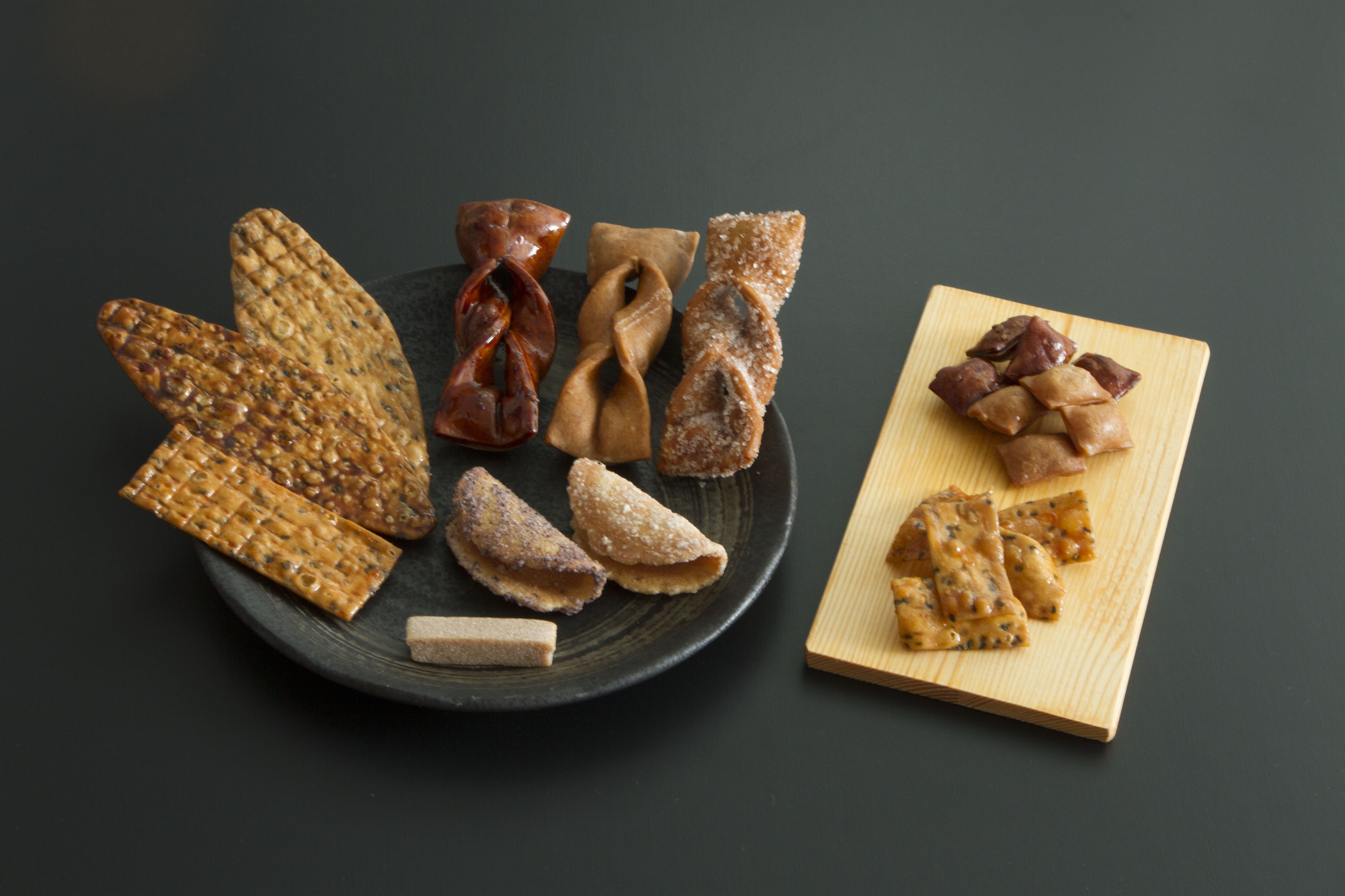 生姜せんべい2個、しそせんべい1個、